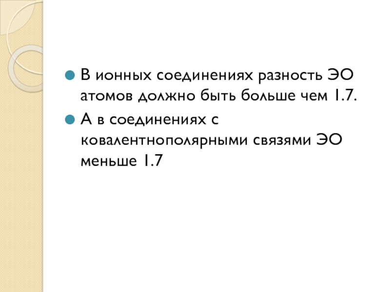 Слайд 4В ионных соединениях разность ЭО атомов должно быть больше чем 1.7.