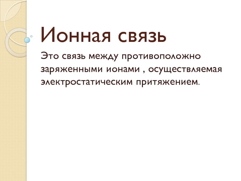 Ионная связьЭто связь между противоположно заряженными ионами , осуществляемая электростатическим притяжением.