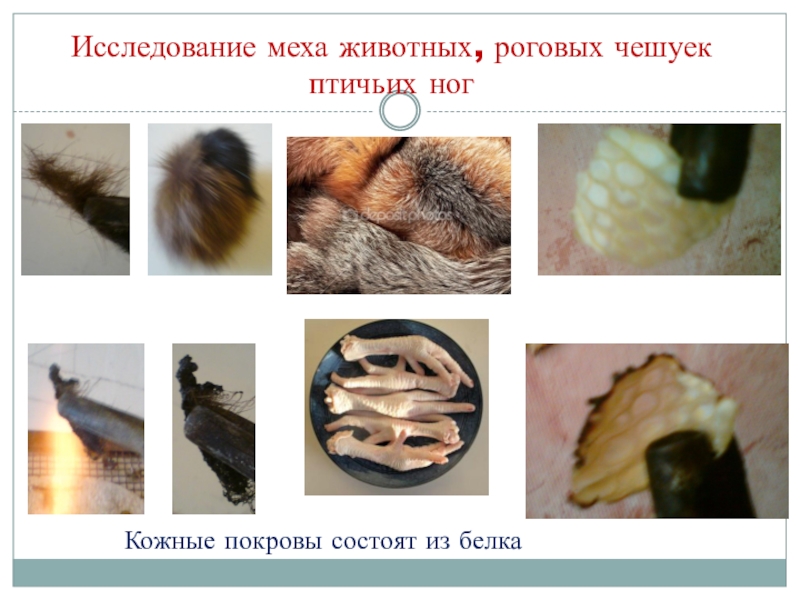 Слайд 15Исследование меха животных, роговых чешуек птичьих ног