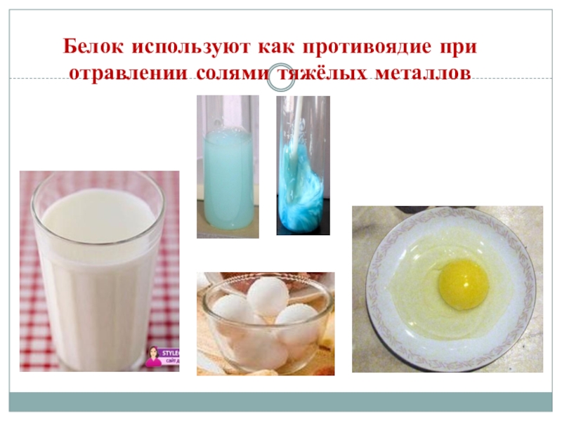 Слайд 40Белок используют как противоядие при отравлении солями тяжёлых металлов