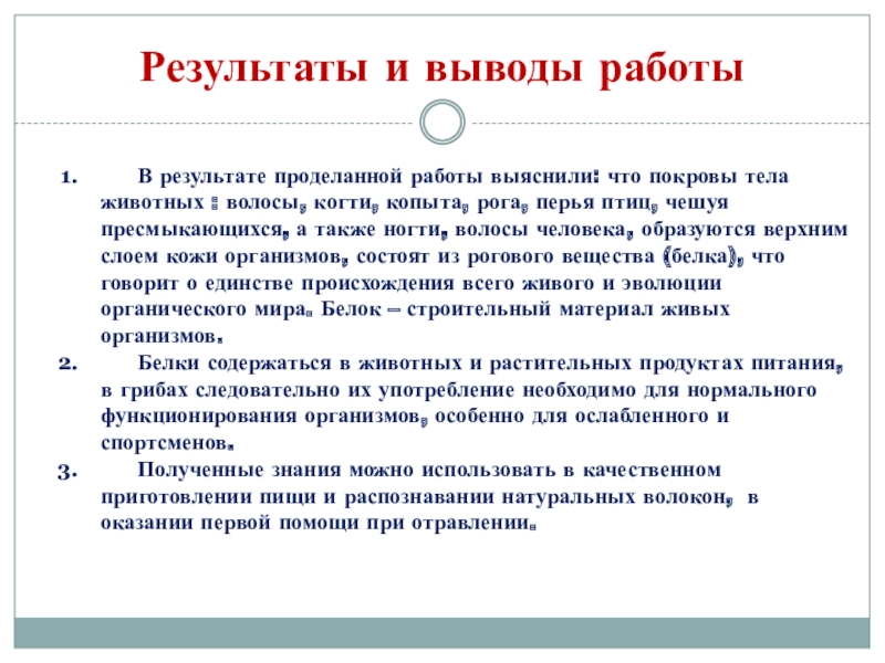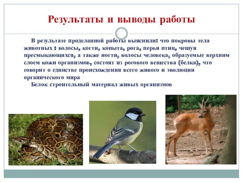 выяснили: что покровы тела животных : волосы, когти, копыта, рога, перья птиц, чешуя пресмыкающихся, а также ногти, волосы человека, образуемые верхним слоем кожи организмов, состоят из рогового вещества (белка), что говорит о единстве происхождения всего живого и эволюции органического мира