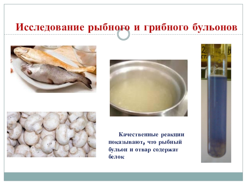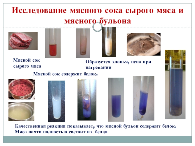 Качественная реакция показывает, что мясной бульон содержит белок. Мясо почти полностью состоит из белка