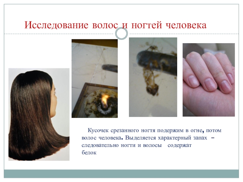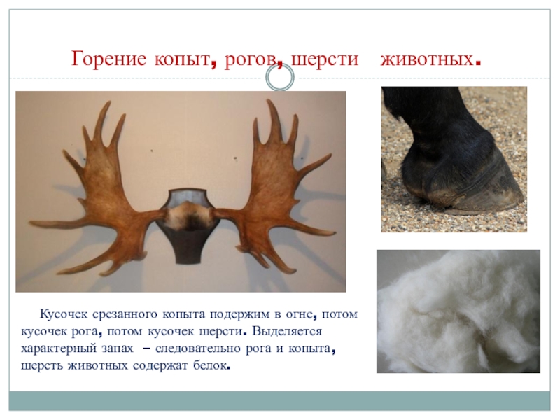 Слайд 14Горение копыт, рогов, шерсти животных.