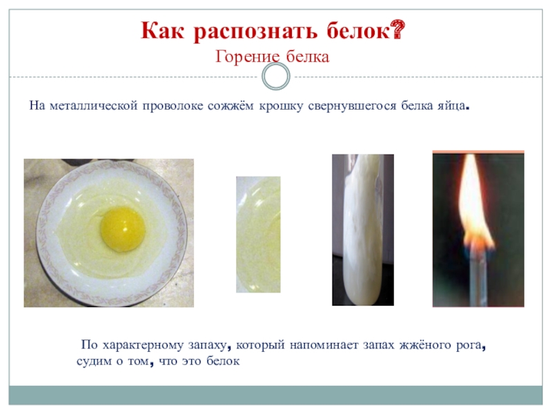По характерному запаху, который напоминает запах жжёного рога, судим о том, что это белок