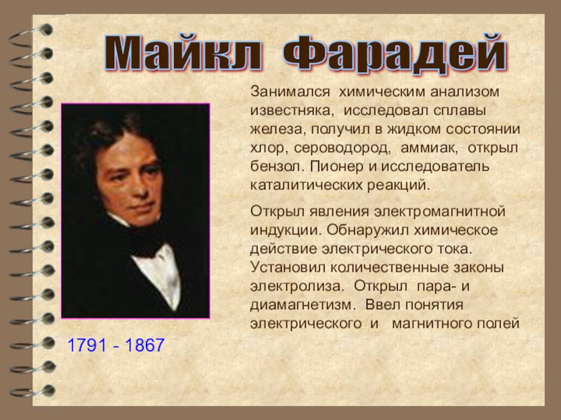 Открыл явления электромагнитной индукции. Обнаружил химическое действие электрического тока. Установил количественные законы электролиза. Открыл пара- и диамагнетизм. Ввел понятия электрического и магнитного полей