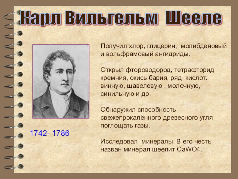 Открыл фтороводород, тетрафторид кремния, окись бария, ряд кислот: винную, щавелевую , молочную, синильную и др.