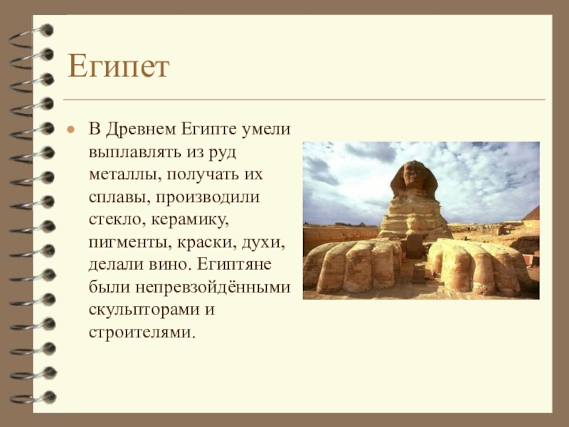 производили стекло, керамику, пигменты, краски, духи, делали вино. Египтяне были непревзойдёнными скульпторами и строителями.