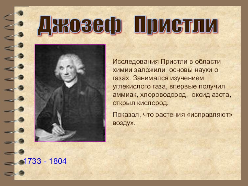 о газах. Занимался изучением углекислого газа, впервые получил аммиак, хлороводород, оксид азота, открыл кислород.