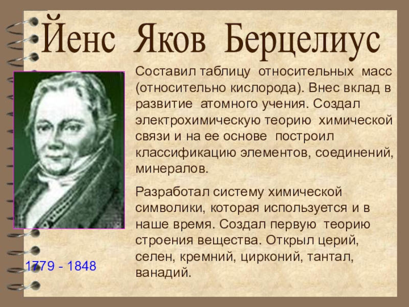 (относительно кислорода). Внес вклад в развитие атомного учения. Создал электрохимическую теорию химической связи и на ее основе построил классификацию элементов, соединений, минералов.