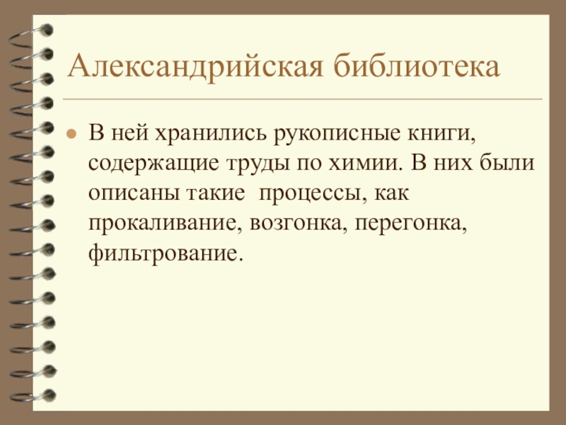 В ней хранились рукописные книги, содержащие труды по химии. В