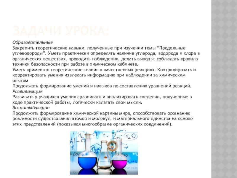 практически определять наличие углерода, водорода и хлора в органических веществах, проводить наблюдения, делать выводы; соблюдать правила техники безопасности при работе в химическом кабинете.