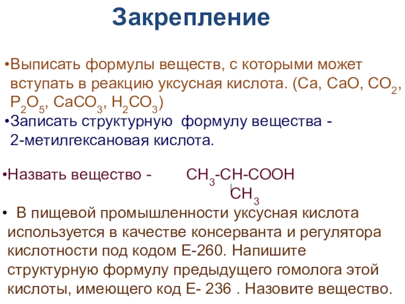 В пищевой промышленности уксусная кислота используется в качестве консерванта и регулятора кислотности под кодом Е-260. Напишите структурную формулу предыдущего гомолога этой кислоты, имеющего код Е- 236 . Назовите вещество.