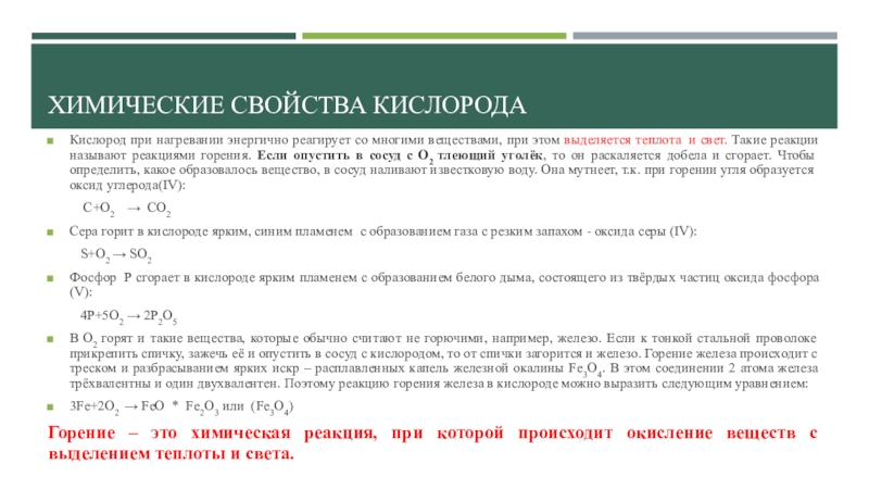 Химические свойства кислородаКислород при нагревании энергично реагирует со многими веществами, при этом выделяется теплота  и свет. Такие