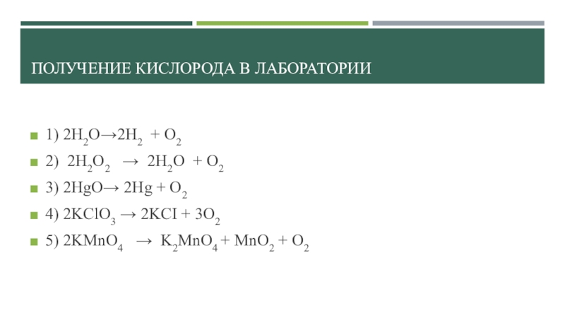 Получение кислорода в лаборатории1) 2H2O→2H2 + O2 2) 2H2O2  → 2H2O + O2   3)