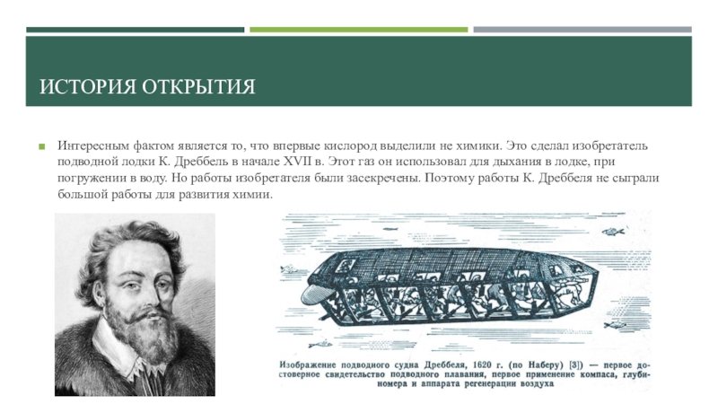 История открытияИнтересным фактом является то, что впервые кислород выделили не химики. Это сделал изобретатель подводной лодки К. Дреббель