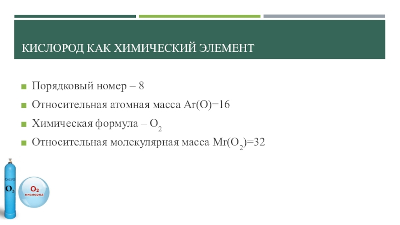 Кислород как химический элементПорядковый номер – 8Относительная атомная масса Ar(O)=16Химическая формула – О2Относительная молекулярная масса Mr(O2)=32