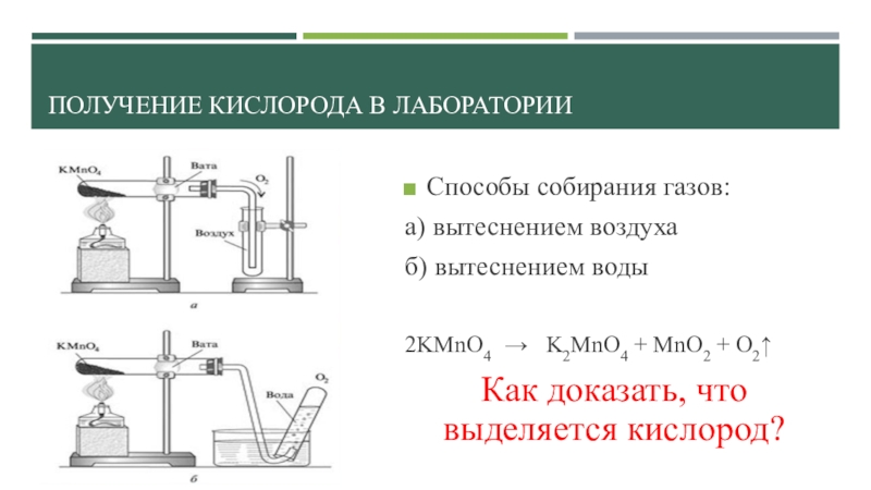 Получение кислорода в лабораторииСпособы собирания газов:а) вытеснением воздухаб) вытеснением воды2KMnO4   →   K2MnO4 + MnO2 + O2↑Как доказать, что