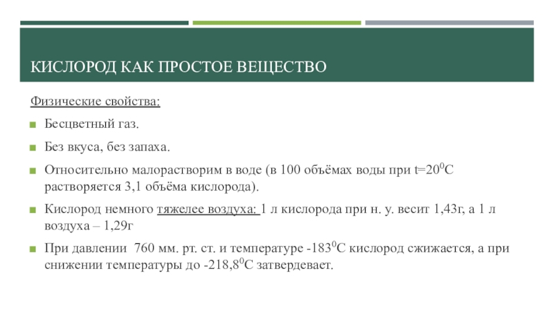 Кислород как простое веществоФизические свойства:Бесцветный газ. Без вкуса, без запаха.Относительно малорастворим в воде (в 100 объёмах воды