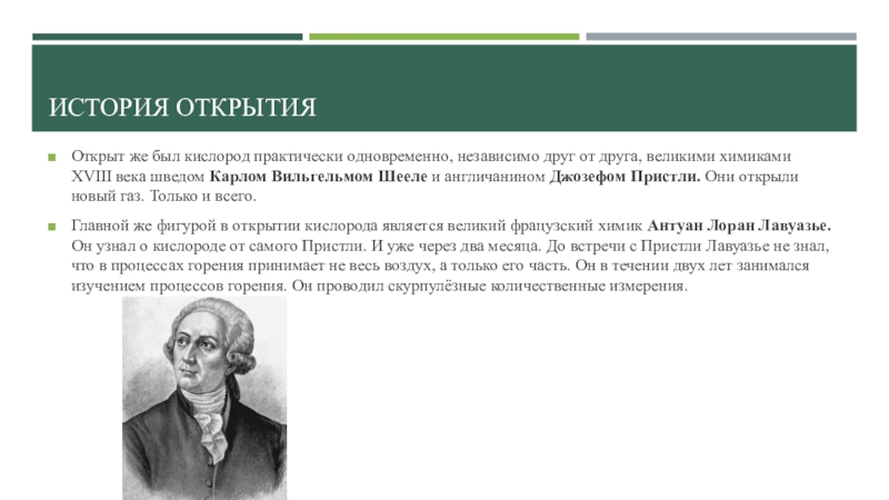 Главной же фигурой в открытии кислорода является великий фрацузский химик Антуан Лоран Лавуазье. Он узнал о кислороде от самого Пристли. И уже через два месяца. До встречи с Пристли Лавуазье не знал, что в процессах горения принимает не весь воздух, а только его часть. Он в течении двух лет занимался изучением процессов горения. Он проводил скурпулёзные количественные измерения.