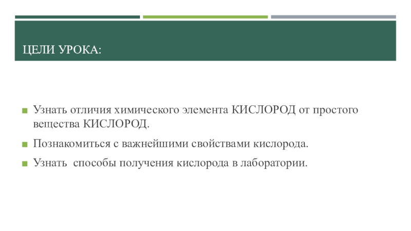 Цели урока:Узнать отличия химического элемента КИСЛОРОД от простого вещества КИСЛОРОД.Познакомиться с важнейшими свойствами кислорода.Узнать способы получения кислорода в лаборатории.