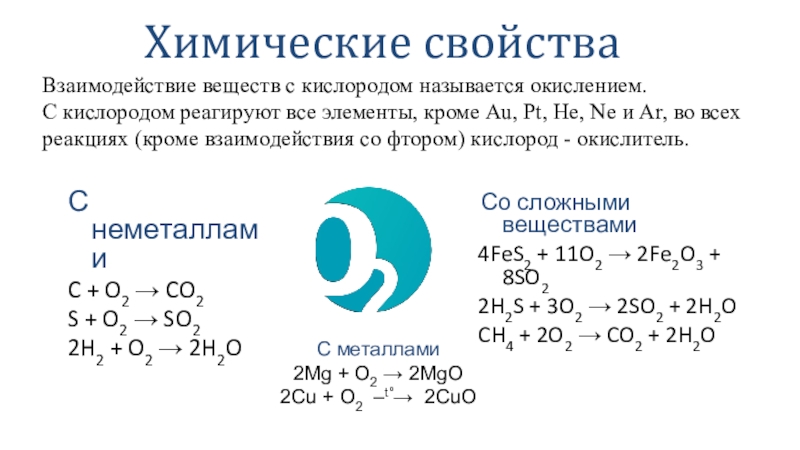 С кислородом реагируют все элементы, кроме Au, Pt, He, Ne и Ar, во всех реакциях (кроме взаимодействия со фтором) кислород - окислитель.