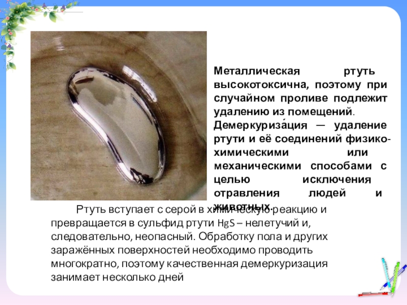 Металлическая ртуть высокотоксична, поэтому при случайном проливе подлежит удалению из помещений.