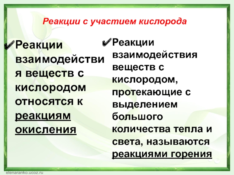 Реакции взаимодействия веществ с кислородом, протекающие с выделением большого количества тепла и света, называются реакциями горения