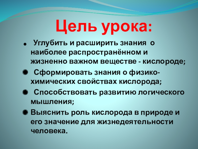 Цель урока: Углубить и расширить знания о наиболее распространённом и жизненно важном веществе - кислороде; Сформировать знания