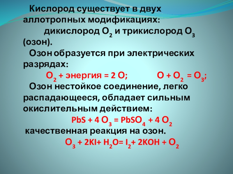 дикислород О2 и трикислород О3 (озон). Озон образуется при электрических разрядах: О2 + энергия = 2 О; О + О2 = О3; Озон нестойкое соединение, легко распадающееся, обладает сильным окислительным действием: PbS + 4 О3 = PbSО4 + 4 О2 качественная реакция на озон. О3 + 2KI+ H2O= I2+ 2KOH + О2