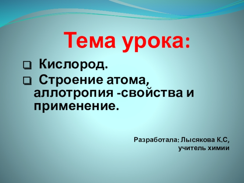 Тема урока:    Кислород.  Строение атома, аллотропия -свойства и применение.  Разработала: Лысякова К.С,