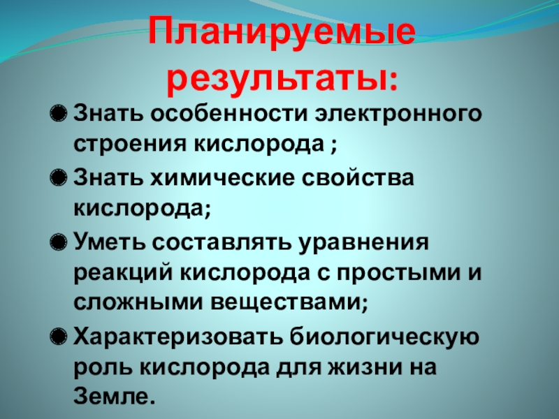 Планируемые результаты:Знать особенности электронного строения кислорода ;Знать химические свойства кислорода;Уметь составлять уравнения реакций кислорода с простыми и