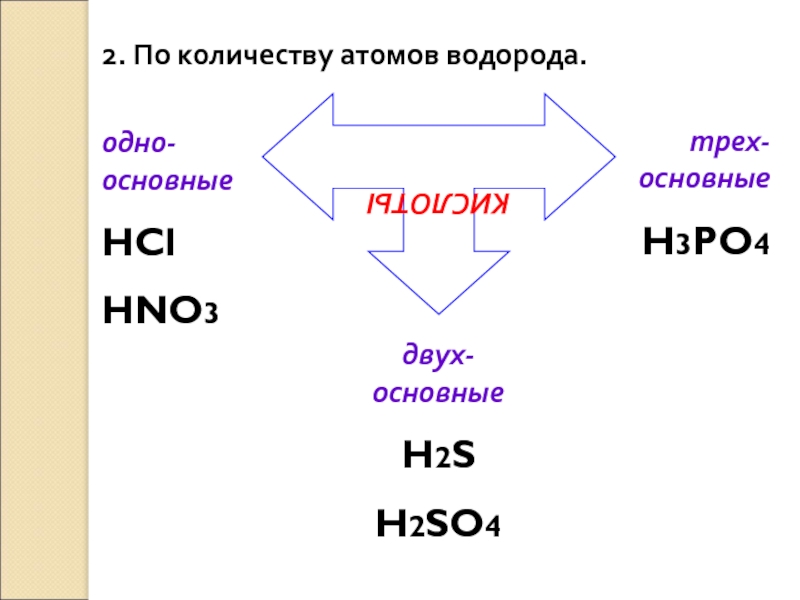 2. По количеству атомов водорода.КИСЛОТЫодно-основныеHClHNO3двух-основныеH2SH2SO4трех-основныеH3PO4