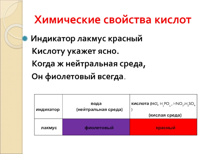 Химические свойства кислотИндикатор лакмус красный   Кислоту укажет ясно.  Когда ж нейтральная среда,  Он