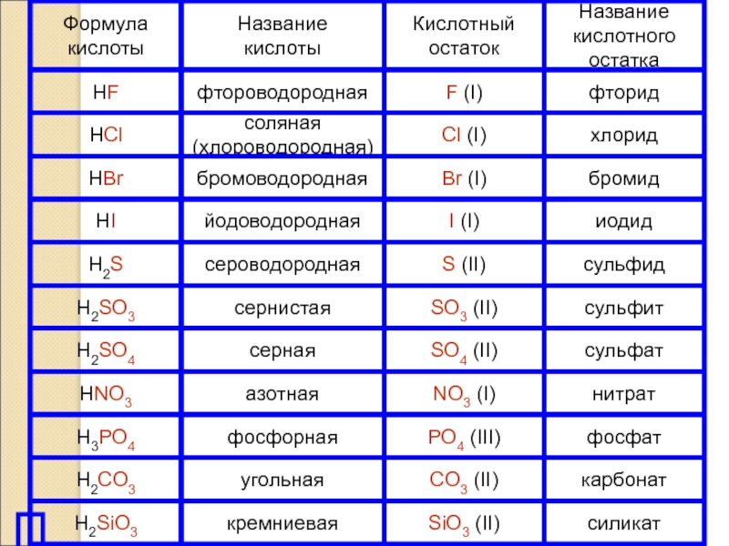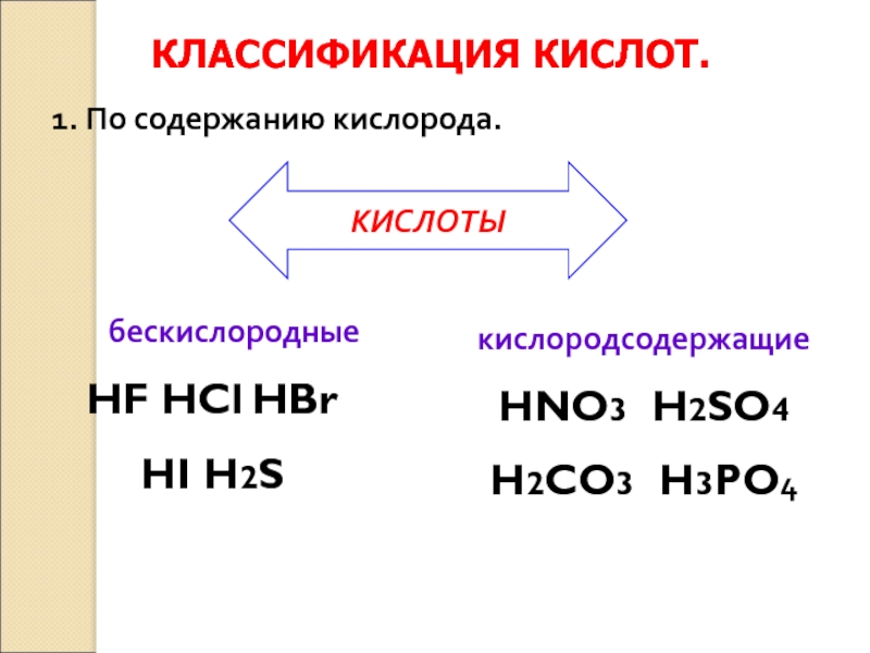 КЛАССИФИКАЦИЯ КИСЛОТ.	бескислородные        HF HCl HBrHI H2S		  	1. По содержанию