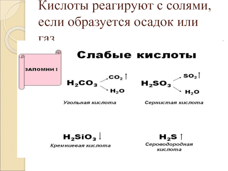 Слайд 20Кислоты реагируют с солями, если образуется осадок или газ.