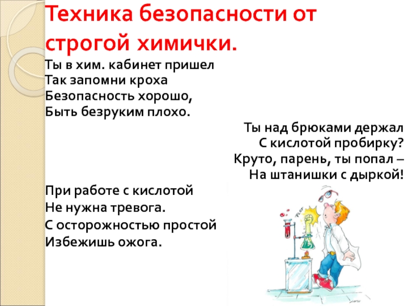 Техника безопасности от строгой химички.Ты в хим. кабинет пришелТак запомни крохаБезопасность хорошо,Быть безруким плохо.Ты над брюками держалС