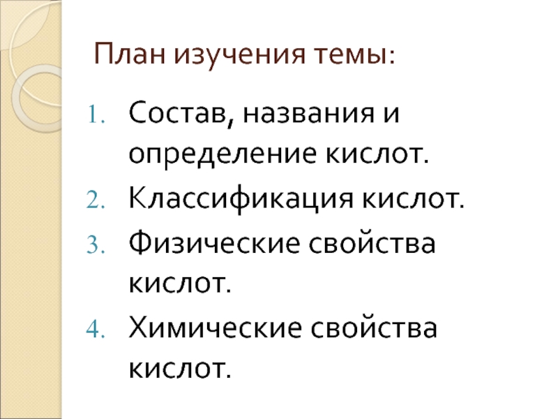 План изучения темы:Состав, названия и определение кислот.Классификация кислот.Физические свойства кислот.Химические свойства кислот.
