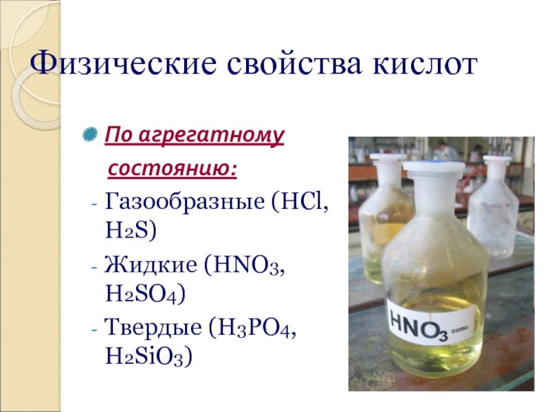 Физические свойства кислотПо агрегатному   состоянию:Газообразные (HCl, H2S)Жидкие (HNO3, H2SO4)Твердые (H3PO4, H2SiO3)