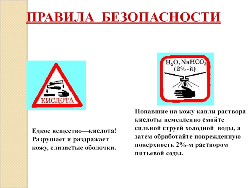 ПРАВИЛА БЕЗОПАСНОСТИЕдкое вещество—кислота! Разрушает и раздражает кожу, слизистые оболочки.Попавшие на кожу капли раствора кислоты немедленно смойте сильной