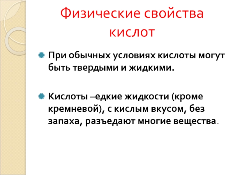 Кислоты –едкие жидкости (кроме кремневой), с кислым вкусом, без запаха, разъедают многие вещества.
