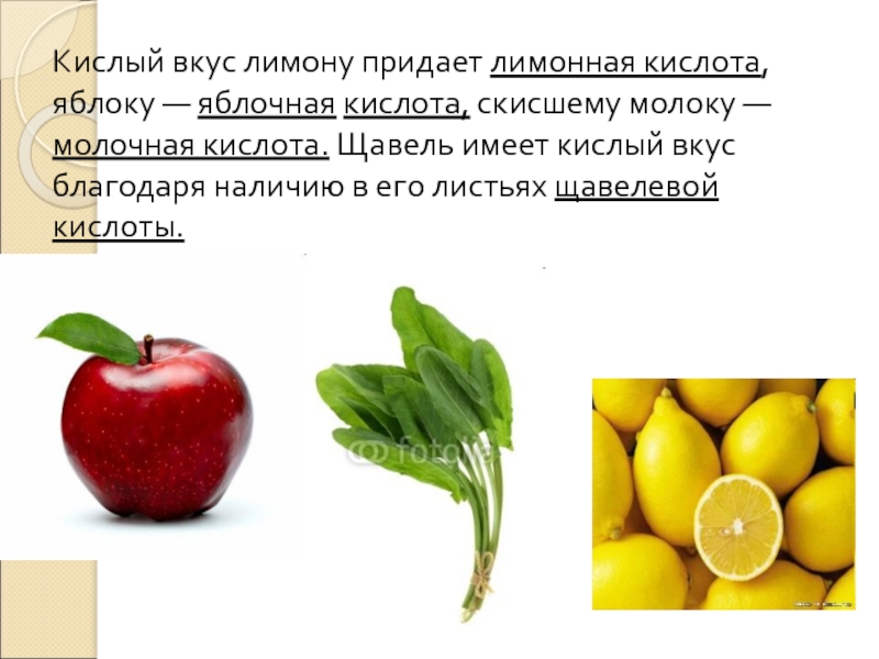 Слайд 3Кислый вкус лимону придает лимонная кислота, яблоку — яблочная кислота, скисшему
