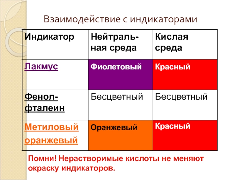 Взаимодействие с индикаторамиПомни! Нерастворимые кислоты не меняют окраску индикаторов.