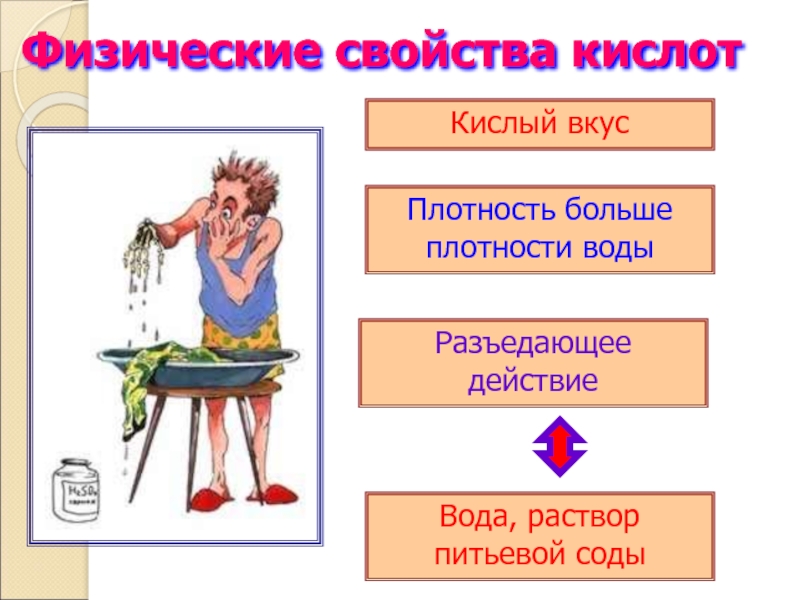 Физические свойства кислотКислый вкусПлотность больше плотности водыРазъедающее действиеВода, раствор питьевой соды