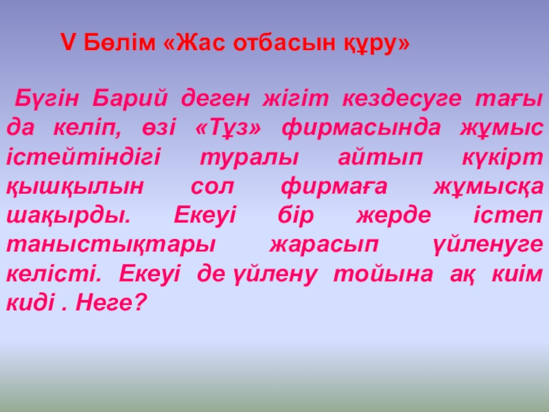 Слайд 15V Бөлім «Жас отбасын құру»