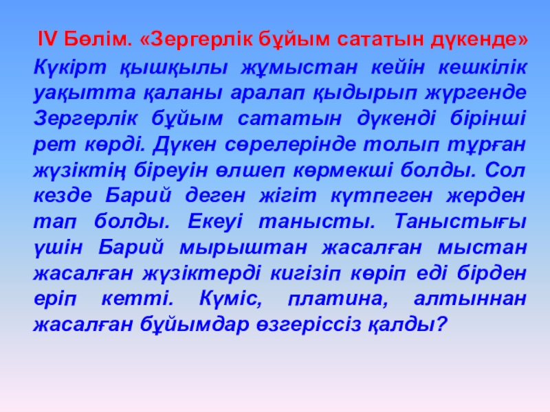 Слайд 14ІV Бөлім. «Зергерлік бұйым сататын дүкенде»