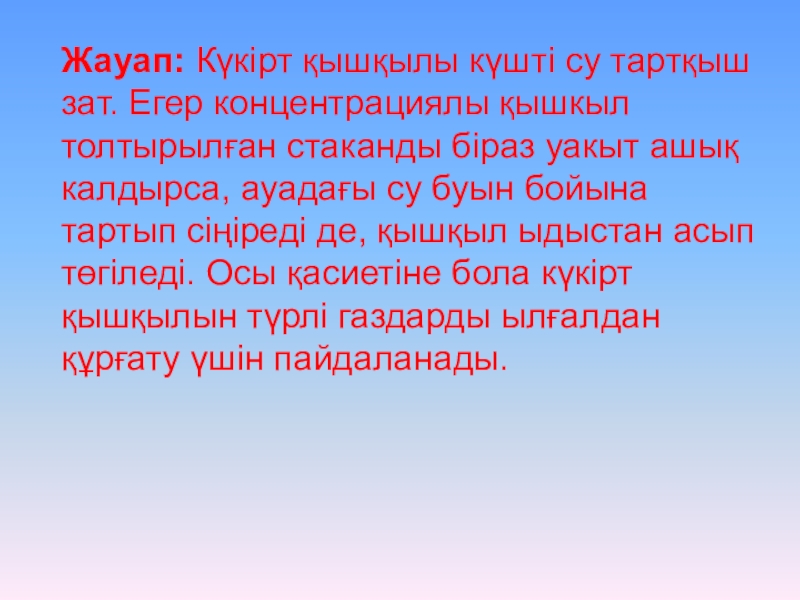 Слайд 17Жауап: Күкірт қышқылы күшті су тартқыш зат. Егер концентрациялы қышкыл толтырылған стаканды біраз уакыт