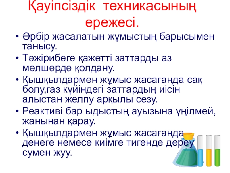 Қышқылдармен жұмыс жасағанда сақ болу,газ күйіндегі заттардың иісін алыстан желпу арқылы сезу.