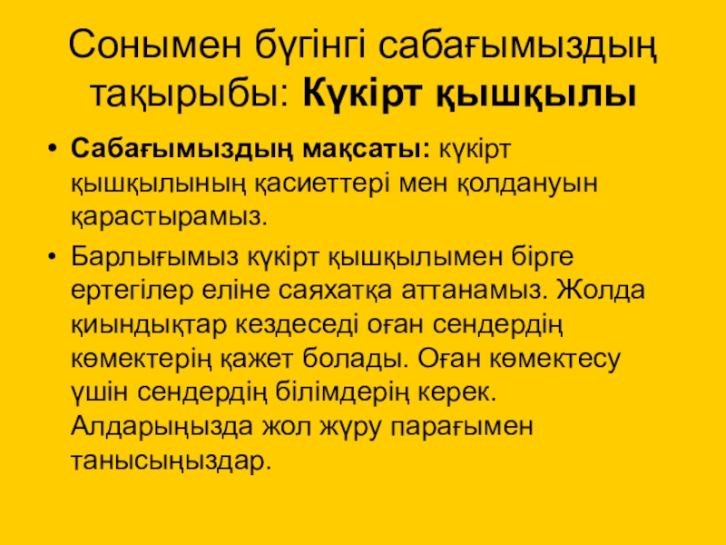 Слайд 5Сонымен бүгінгі сабағымыздың тақырыбы: Күкірт қышқылы