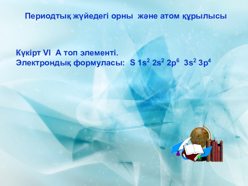Периодтық жүйедегі орны және атом құрылысыКүкірт VІ А топ элементі.Электрондық формуласы: S 1s2 2s2 2p6 3s2 3p4
