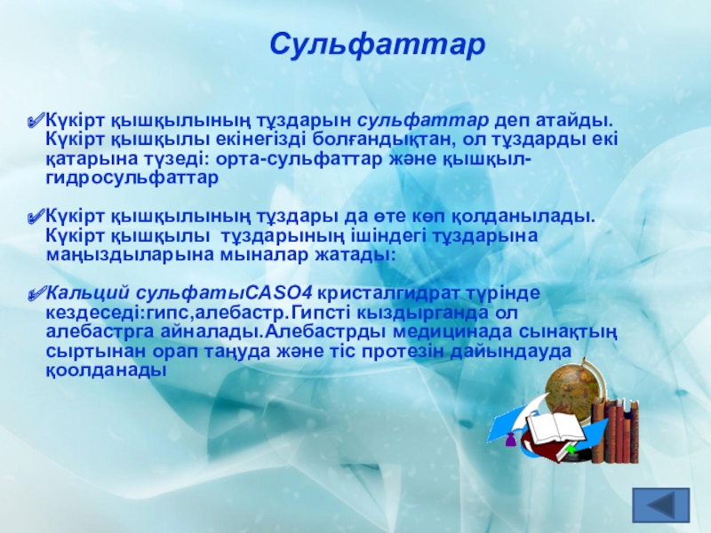 Кальций сульфатыCASO4 кристалгидрат түрінде кездеседі:гипс,алебастр.Гипсті кыздырганда ол алебастрга айналады.Алебастрды медицинада сынақтың сыртынан орап таңуда және тіс протезін дайындауда қоолданады